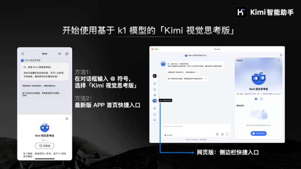 1. APP: Enter the @ symbol in the dialogue box and select the Kimi Visual Thinking Edition.
